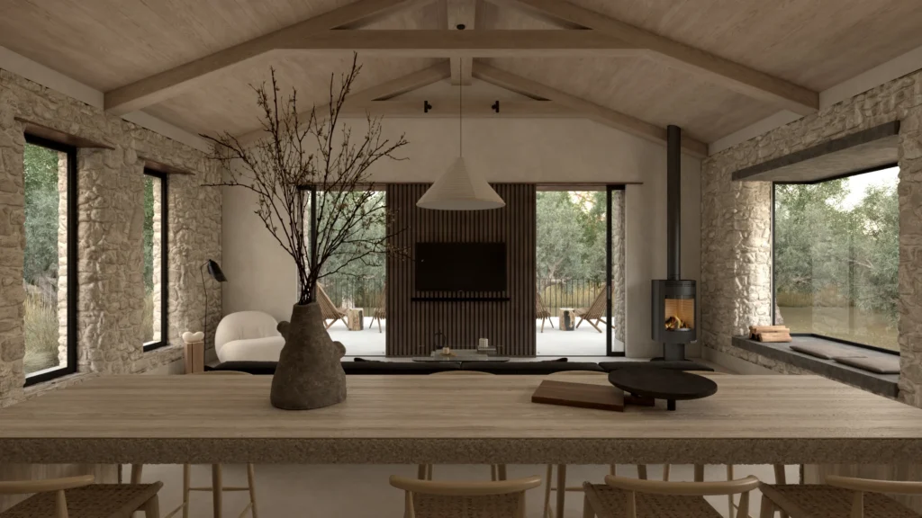 interior exterior design Αυτό το έργο κατασκευής αποτελεί μια πλήρης αντανάκλαση του φυσικού περιβάλλοντος που το περιβάλλει. Οι πέτρινοι τοίχοι, τόσο στο εσωτερικό όσο και στο εξωτερικό της οικίας, εναρμονίζονται