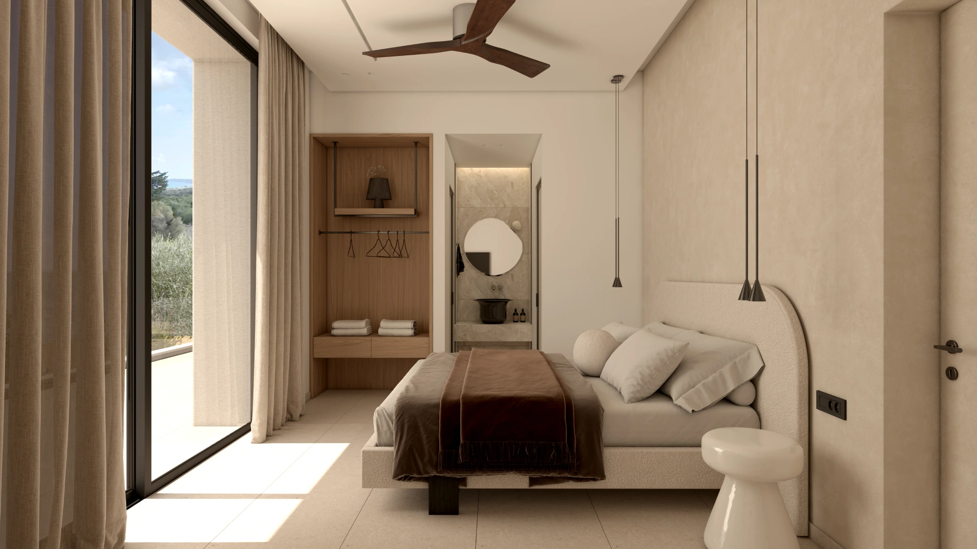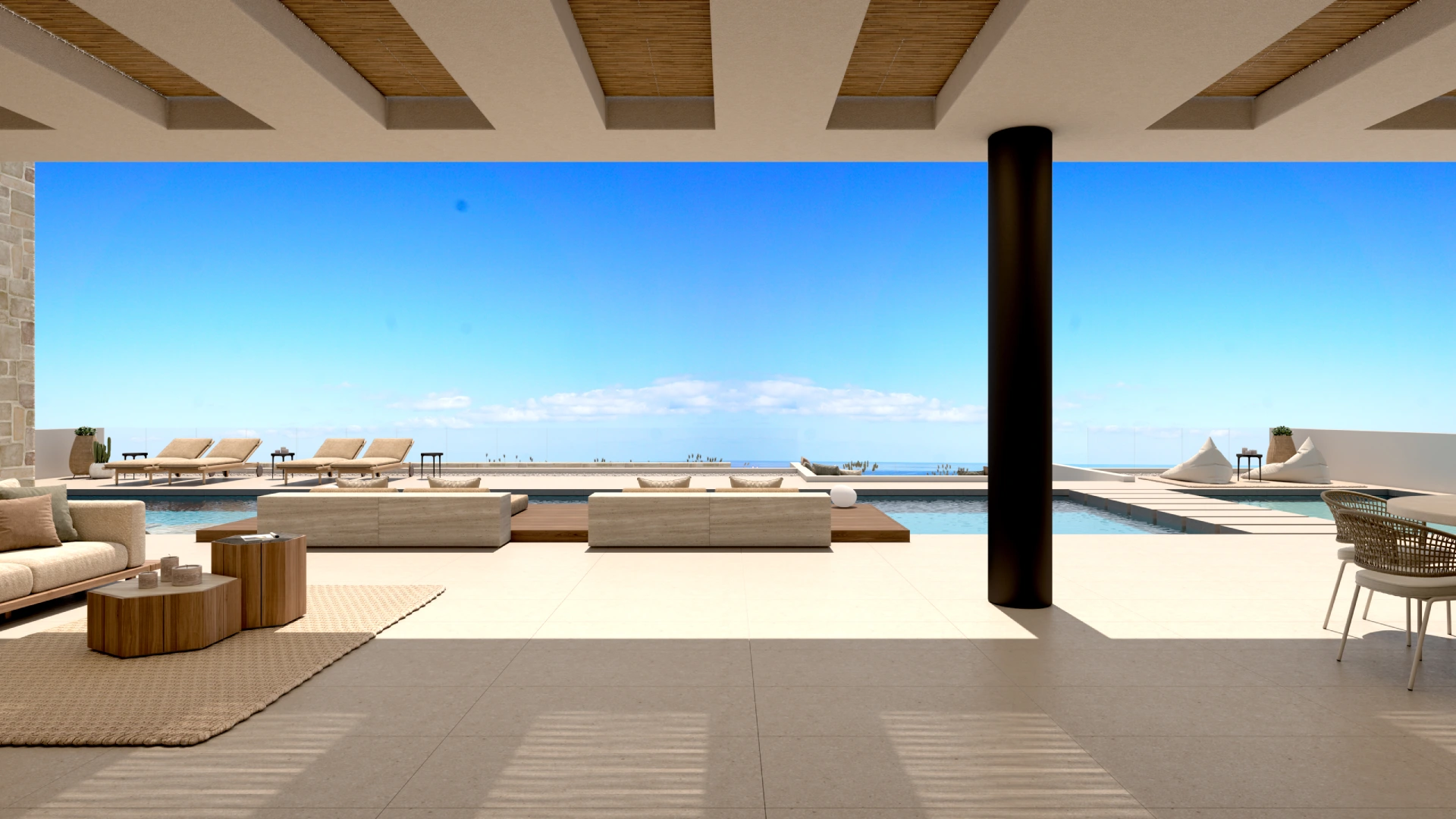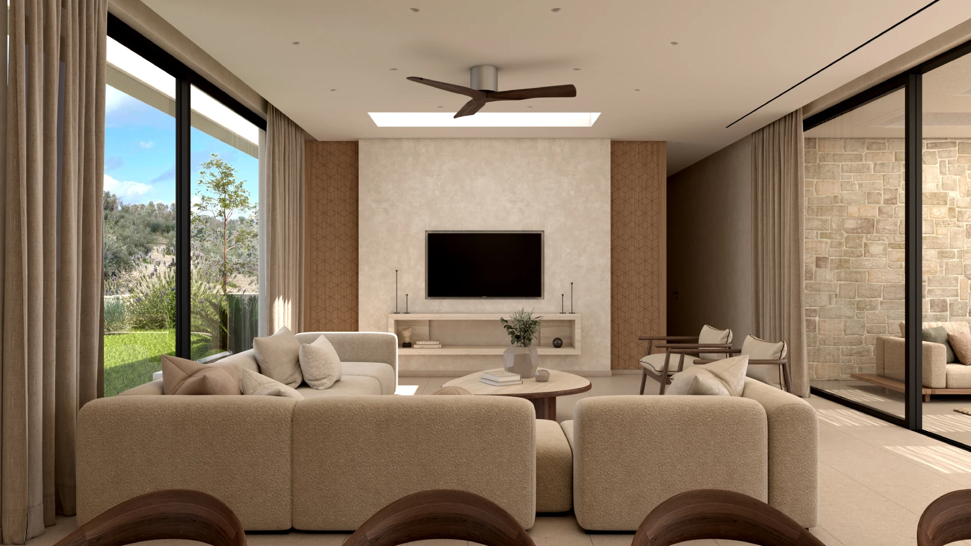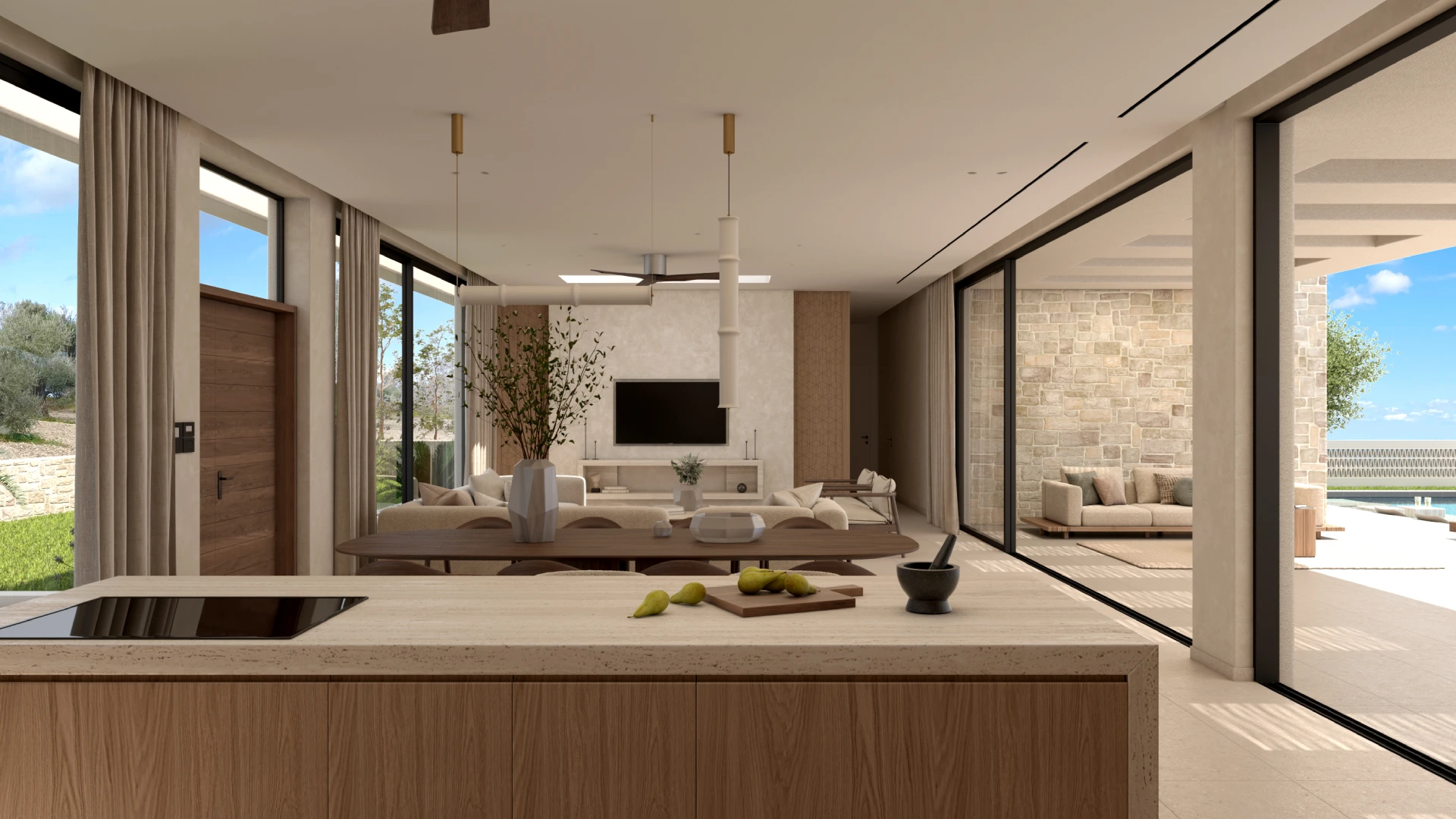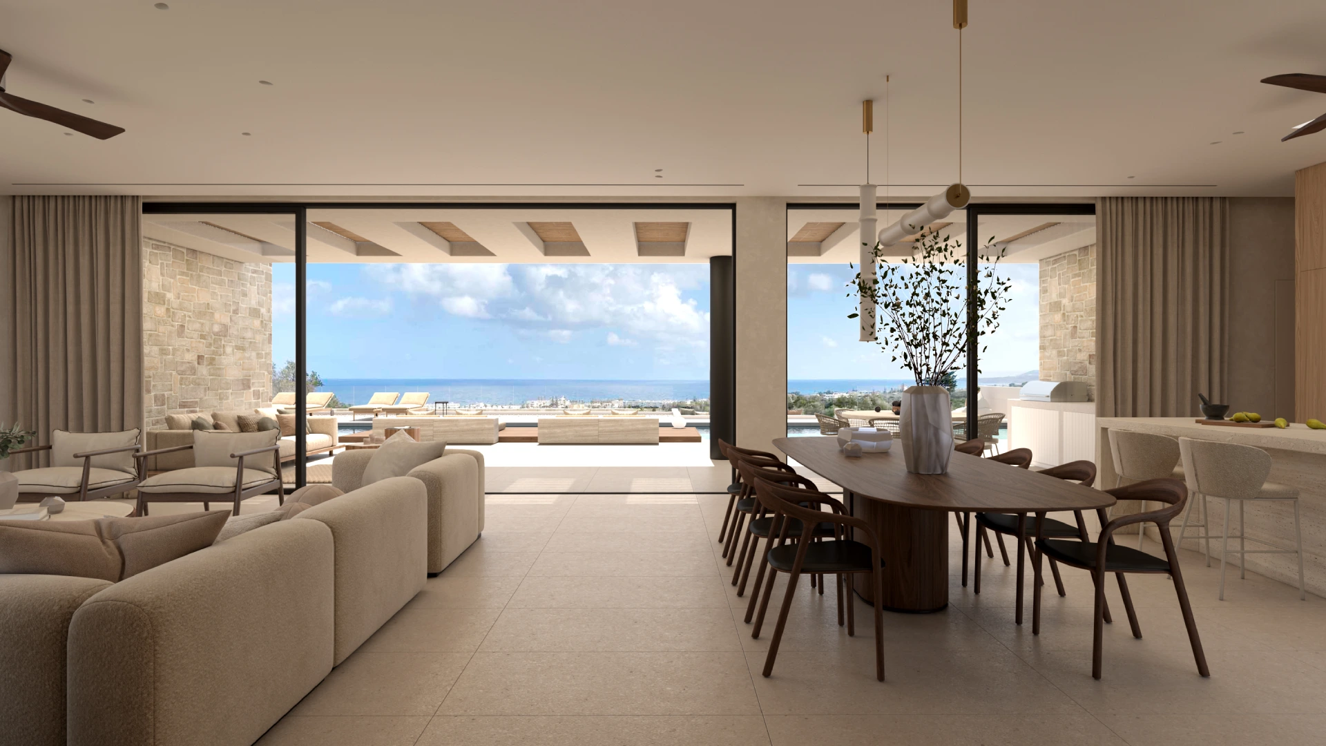 Η χρήση φυσικών πετρωμάτων και οργανικών στοιχείων δημιουργεί μια ενδιαφέρουσα αισθητική, η οποία ολοκληρώνεται με την εσωτερική διακόσμηση. Στο εσωτερικό της βίλας έχουν χρησιμοποιηθεί δύο διαφορετικοι τόνοι ξύλου προσδίδοντας μια ενδιαφέρουσα τάση. Οι επενδύσεις που διακοσμούν τους τοίχους ενισχύουν το παιχνίδι του φωτός και της σκιάς, δημιουργώντας μια μαγευτική ατμόσφαιρα που αναδεικνύει την κομψότητα και την πολυτέλεια της βίλας.