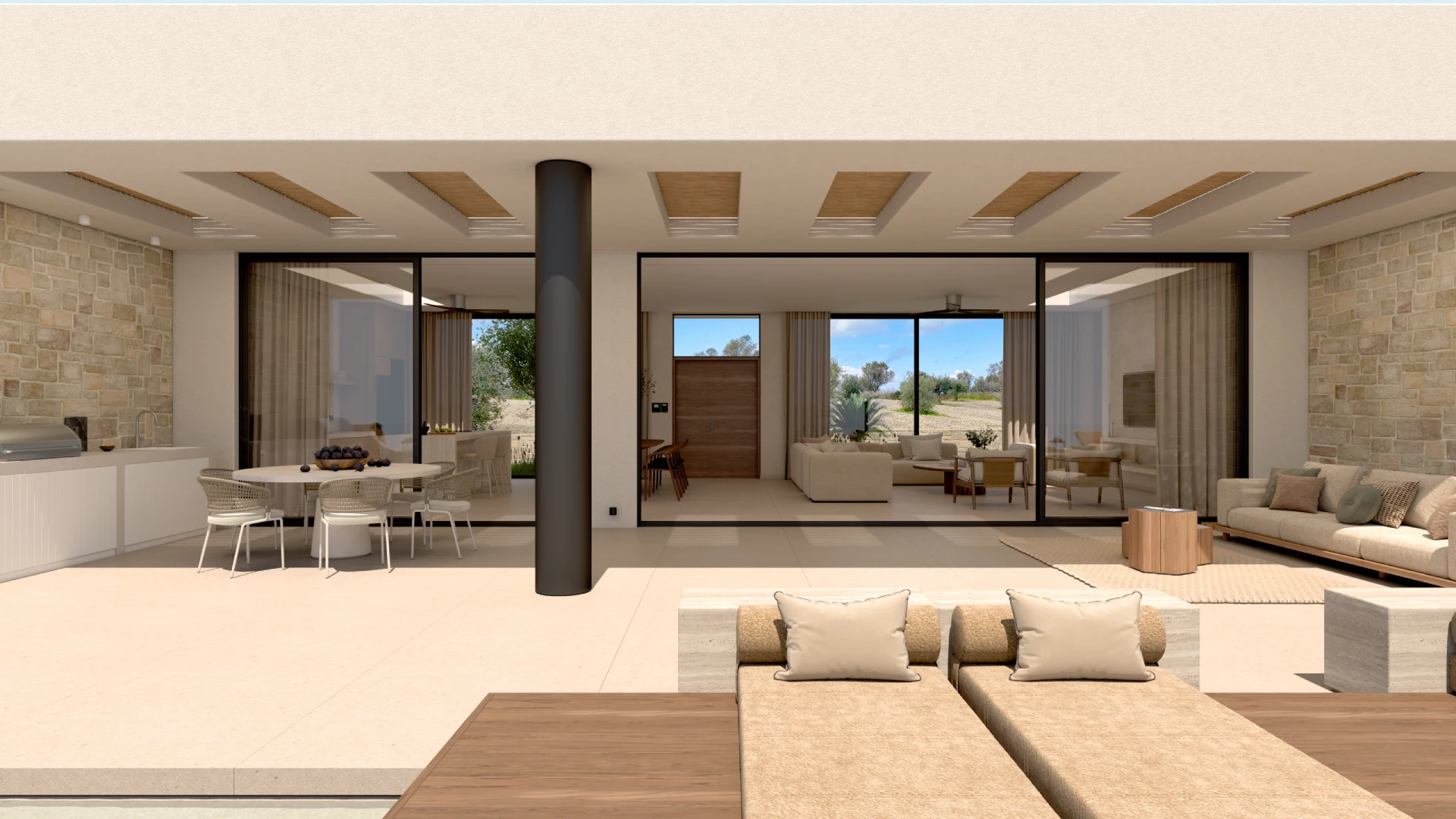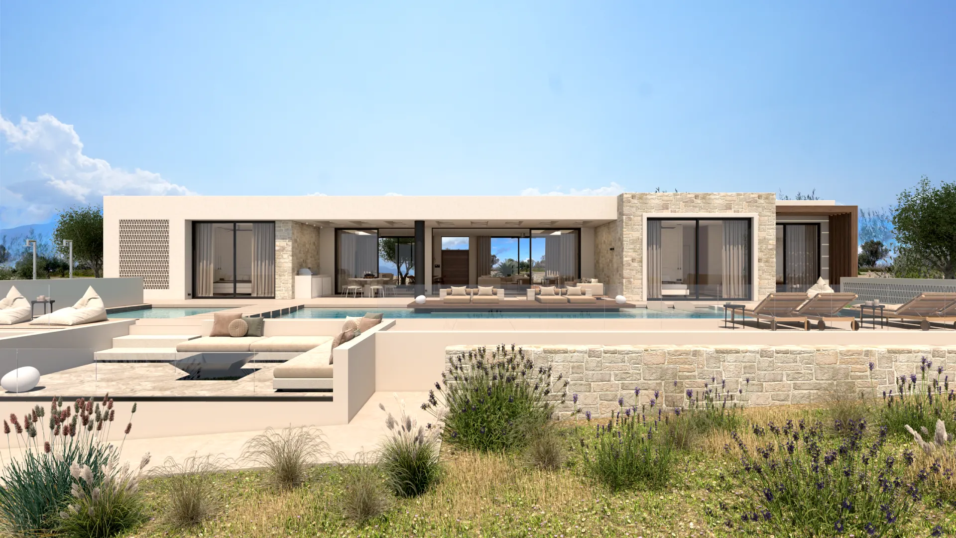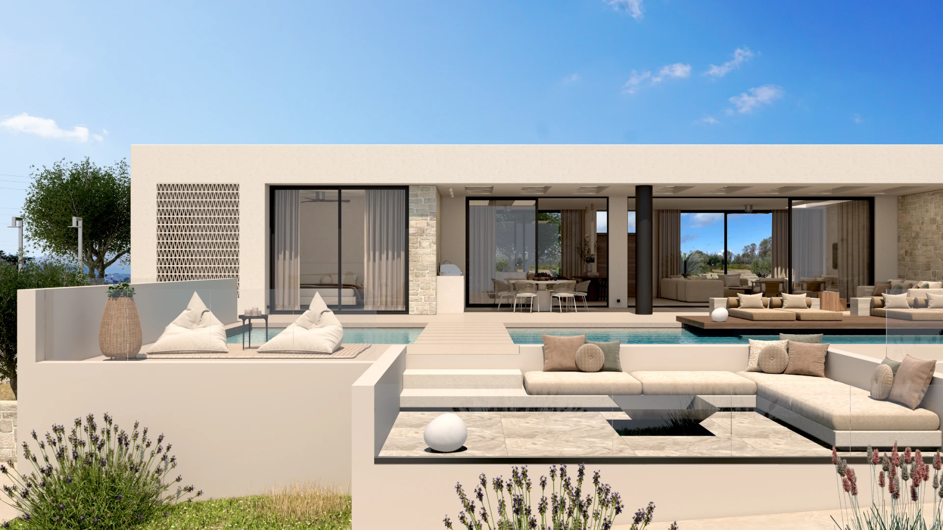 Οι χώροι σχεδιάστηκαν με στόχο την ενοποίηση του εξωτερικού με το εσωτερικό, δημιουργώντας ένα σύνολο που αναδεικνύει τη φύση του περιβάλλοντος. Τα ψηλά ταβάνια κάνουν το σπίτι ευρύχωρο , ενώ οι μεγάλες τζαμαρίες και οι μεγάλοι κοινόχρηστοι χώροι εσωτερικά και εξωτερικά το συμπληρώνουν.