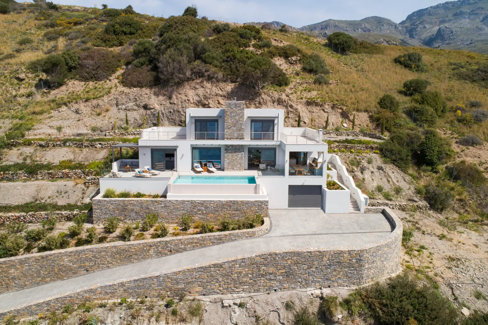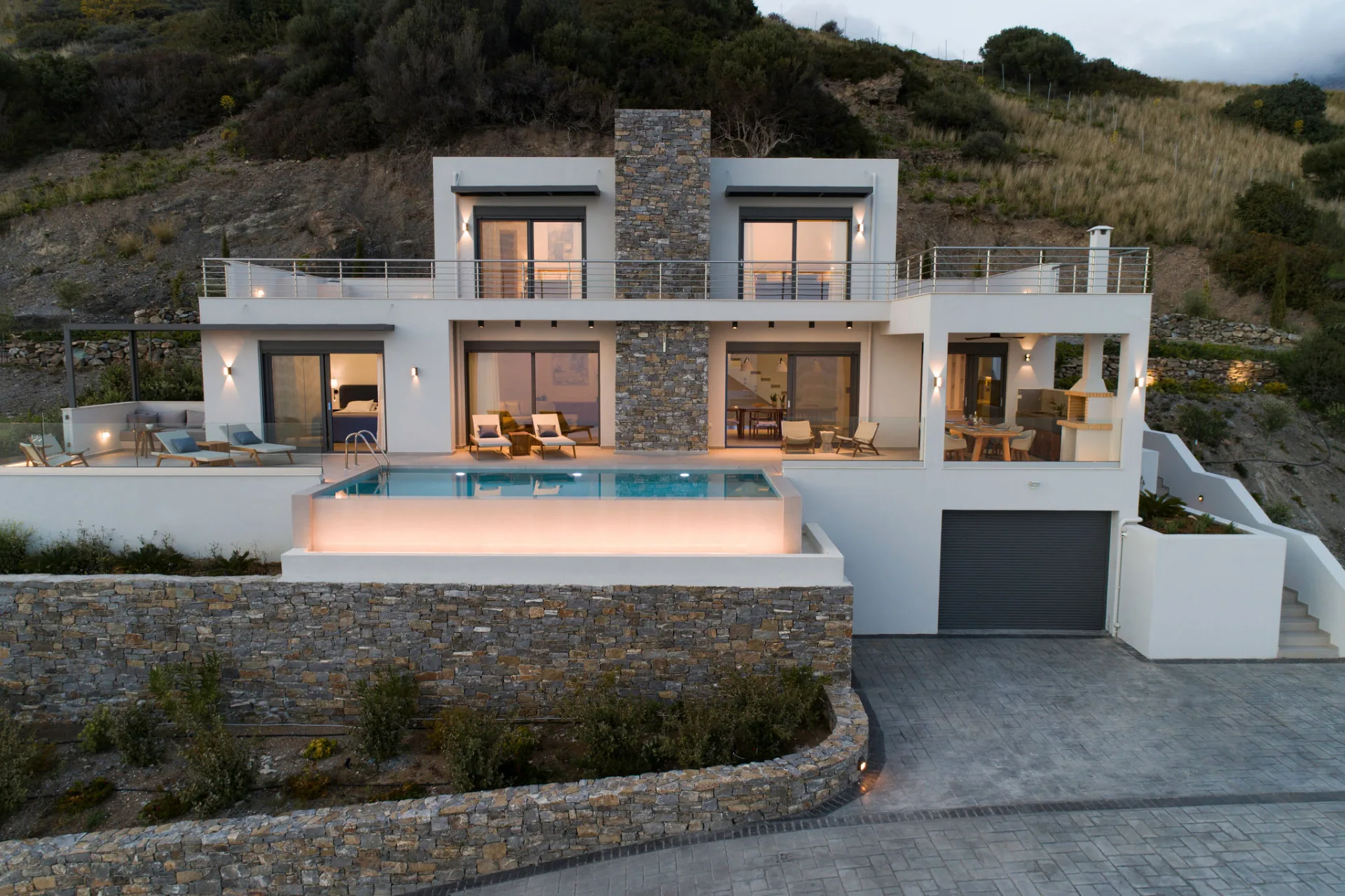 Η κατοικία έχει περίπου 165 τμ κύριους χώρους καθώς και 120τμ βοηθητικούς υπόγειους χώρους. Έχει σχεδιαστεί σε αρμονία με την περιοχή και συνδυάζει πέτρα, γυαλί και γήινες αποχρώσεις. Στο ισόγειο διαθέτει μεγάλη βεράντα και πισίνα τύπου infinity η οποία δημιουργεί την αίσθηση ότι η βίλλα βρίσκεται πάνω στην θάλασσα. Έχει εκπληκτική θέα στον Λυβικό πέλαγος και η κατοικία θα κατασκευαστεί σε οικόπεδο 4986,22 τμ. Αποτελείται από 3 υπνοδωμάτια, 4 μπάνια, μεγάλους κοινόχρηστους χώρους με μεγάλα κουφώματα (σαλόνι, κουζίνα κλπ), υπόγειο γκαραζ, κελάρι, γυμναστήριο και σάουνα. Έχει σχεδιαστεί να φιλοξενεί ανθρώπους που θα θέλουν η διαμονή τους να είναι σε φυσικό Κρητικό περιβάλλον και σε μοντέρνο αρχιτεκτονικά κτίριο. Ο στόχος είναι να αναδειχθεί το θαυμάσιο τοπίο, το οποίο συνδυάζει το ορεινό τμήμα της Κρήτης και την απεριόριστη θέα στη θάλασσα.